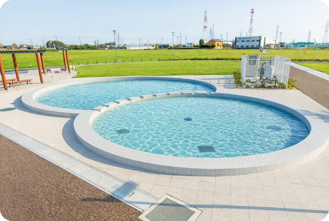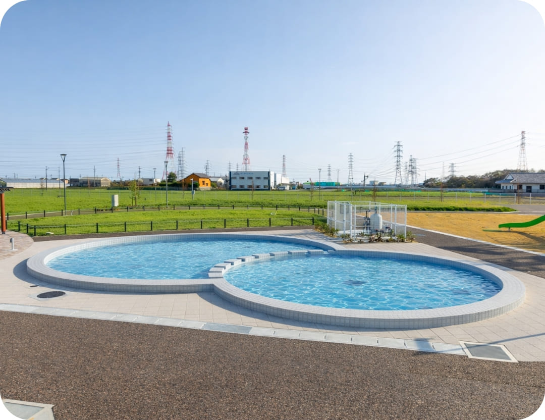 空が広く感じられる開放的な水遊びエリア。周囲の広場や遊具と一体になっており、家族でゆったり過ごせます。