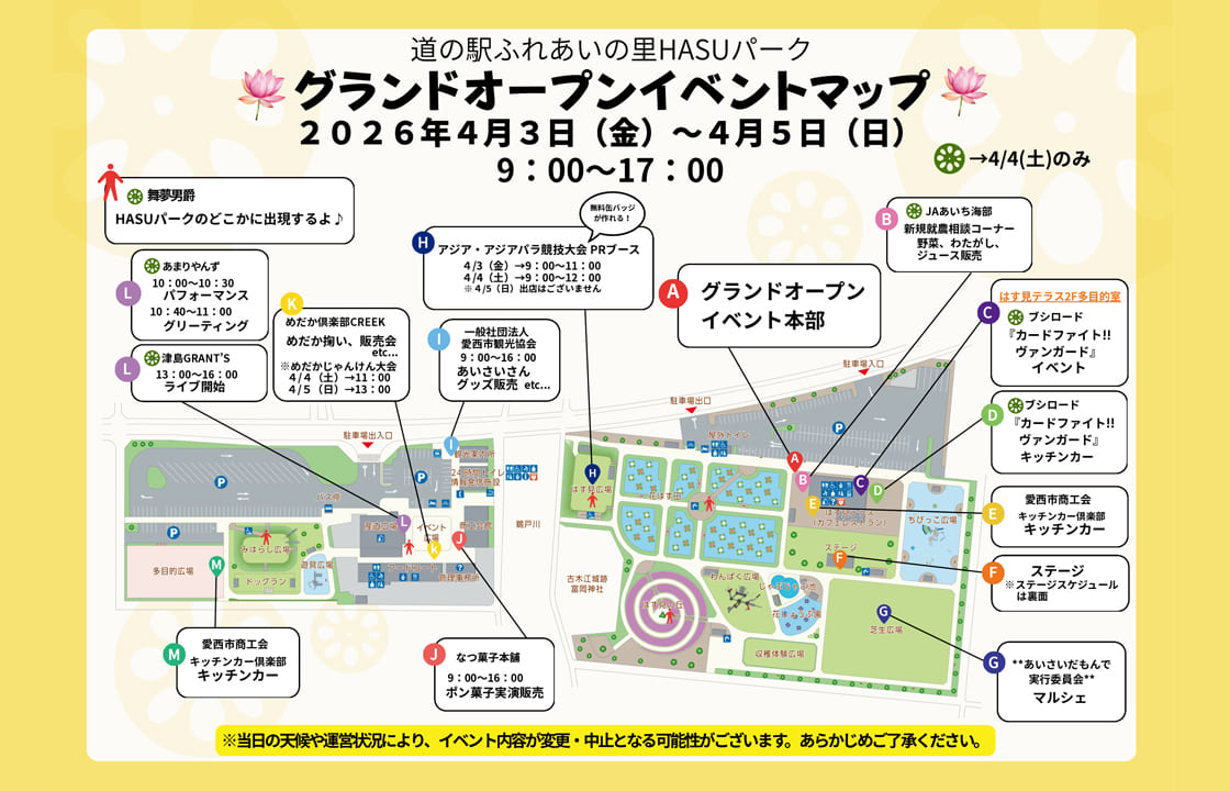 明日開催予定の「愛西HASUパーク グランドオープニングイベント(4月4日・土)」につきまして、雨予報のため内容を一部中止とさせていただきます。